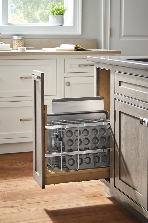 Trays, muffin tins, and cookie sheets will be right and home and easy to access with the Roll-out Tray Divider.