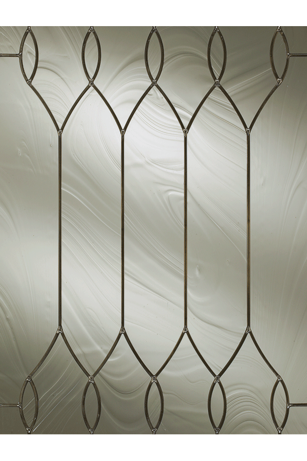 The wavy texture of the Merrimack glass door, married with the delicate loops and lines of the dark leading, create a carefree and elegant look.  Watch your traditional and transitional designs come to life when using this glass door
